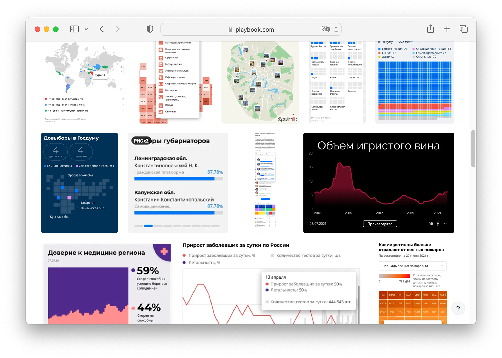We have developed various publication formats for mobile and desktop screens: race chart, tiled map of Russia, slide-show, cards-stories, image with zoom, picture was/then and others.